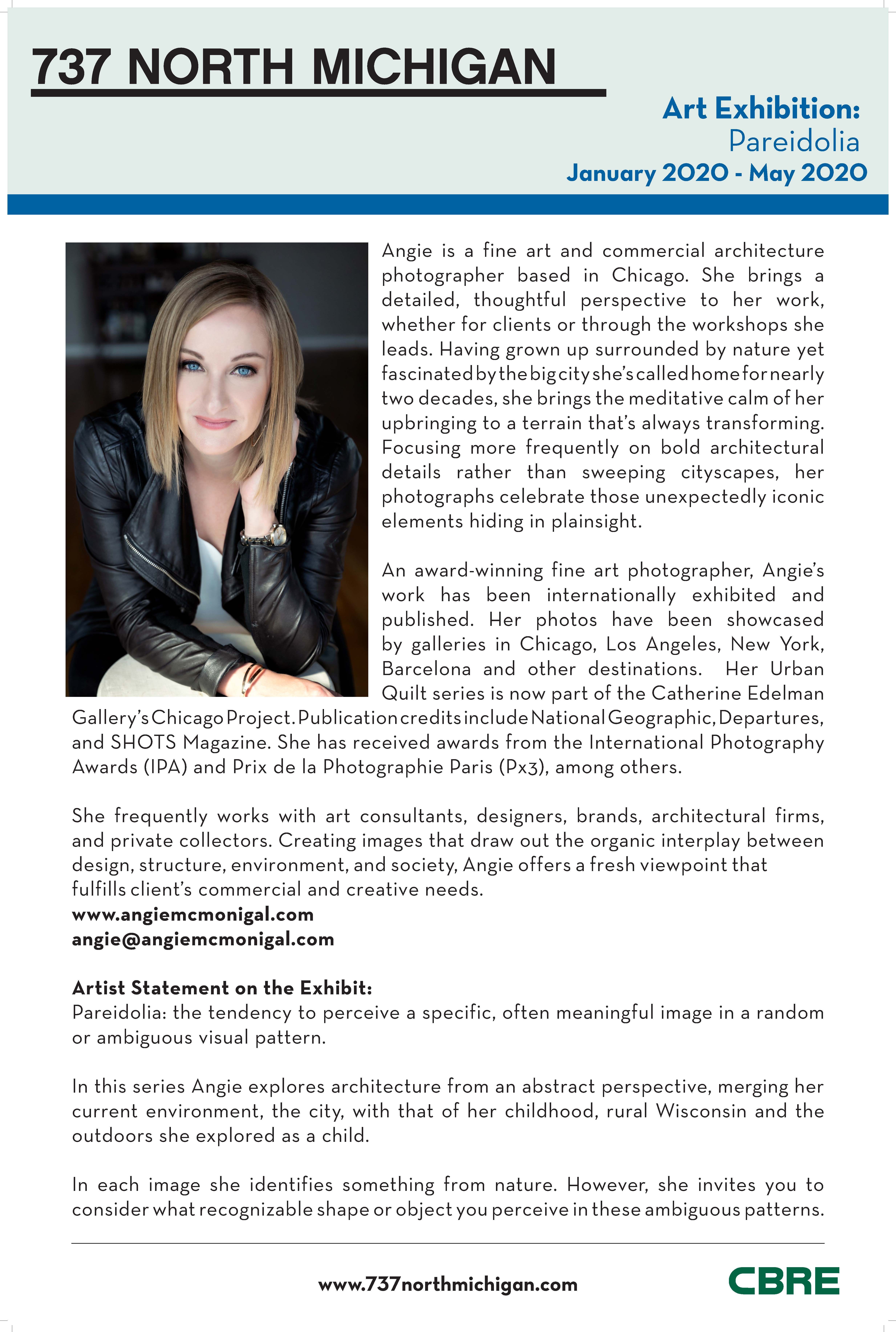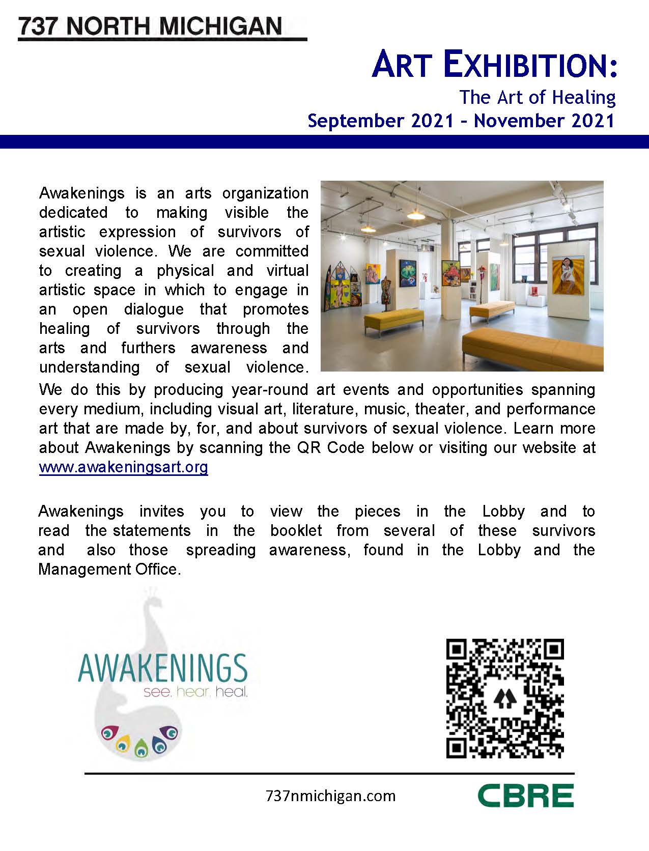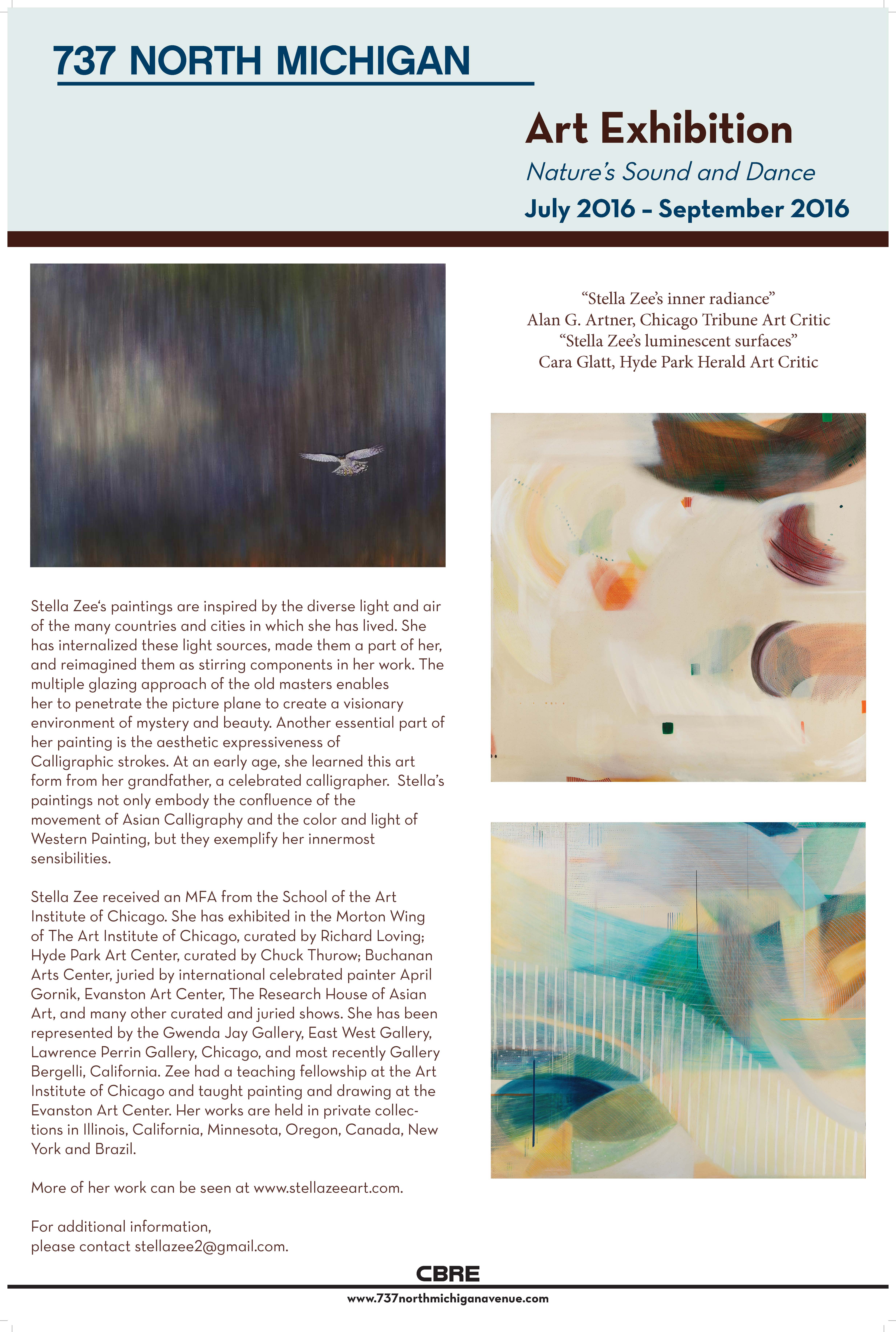 737 North Michigan hosts an ongoing program of revolving, curated art exhibitions featuring local, national and international artists. Catering to the culturally sophisticated and diverse tenancy of the building, the art exhibitions showcase all forms of art ranging from garments to paintings to sculpture.